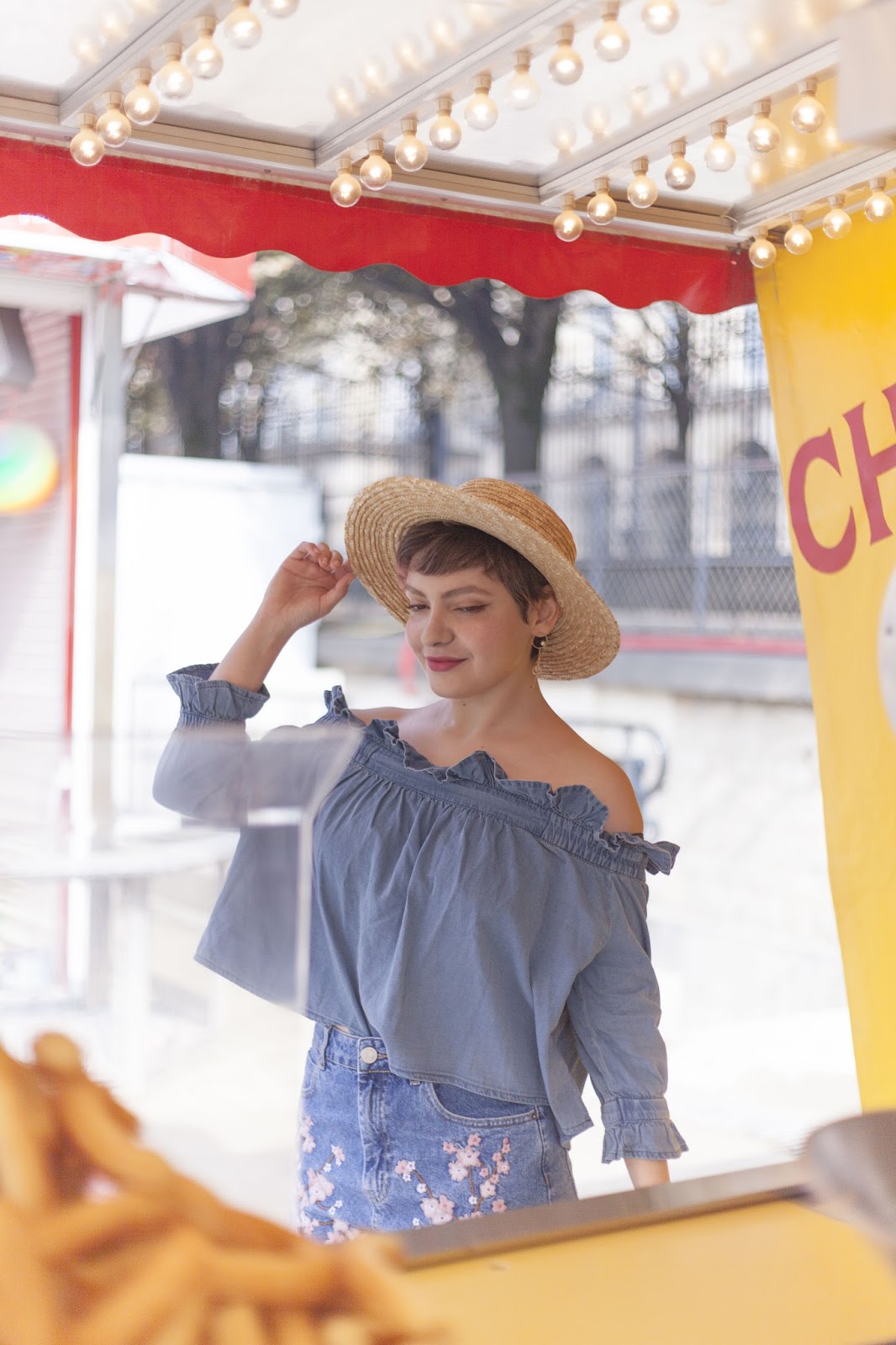 Pour l'occasion j'ai sorti mon adorable canotier avec son ruban en dentelle que j'ai associé avec mon top off-shoulders. J'aime tellement la coupe de haut....et encore une fois....ya des volants x))